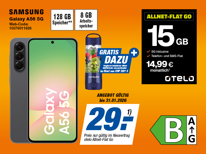 4) Preis gilt bei Neuabschluss des Tarifs Allnet Flat Max mH0, mtl. Paketpreis 29,99 €, Mindestlaufzeit 24 Monate. Einmaliger Bereitstellungspreis 0 € statt 39,99 € bei Buchung der Promotion „Hol Dir den Anschlusspreis zurück“ in der Mein Otelo App innerhalb von 7 Tagen nach Vertragsaktivierung. Fürs Surfen im deutschen Vodafone-Netz hast Du ein Inklusivvolumen von 100 GB. Nach Verbrauch der 100 GB kann beliebig oft weiteres Datenvolumen in Schritten von jeweils 1 GB über die Mein otelo App nachgebucht werden. Die geschätzte maximale Bandbreite beträgt 50 Mbit/s im Download und 25 Mbit/s im Upload, ab Verbrauch der 100 GB und ohne Nachbuchung 64 kbit/s im Up-/Download; Taktung 10 kB. Zusätzlich bekommst Du eine Sprach- und SMS-Flat in alle dt. Netze (keine Sonderrufnummern). 5G inklusive: In den Tarifen otelo Allnet-Flat Go, otelo Allnet-Flat Classic und otelo Allnet-Flat Max: Erhalte 5G mit LTE 50 inklusive. An 5G-Standorten kannst Du mit 5G-fähiges Handy im 5G-Netz surfen. An anderen Standorten surfst Du in 4G. Du surfst mit der Geschwindigkeit deines zugrundeliegenden Tarifes. Alle 5G-Standorte findest du auf otelo.de/5g.