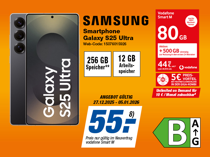 8) Preis gilt bei Neuabschluss des Tarifs Smart M mit Dealcloser, mtl. Paketpreis 44,99 €. Mindestlaufzeit 24 Monate. Einmaliger Anschlusspreis 39,99 €. Du hast eine Flat für Standard-Gespräche in dt. Netze und eine SMS-Flat in dt. Mobilfunknetze. Sondernummern sind ausgeschlossen. Du surfst bis zu einem Datenvolumen von 80 GB/Mon. (statt 40 GB/Mon.) mit der jeweils größtmöglichen Bandbreite mit Vodafone. Bei Abschluss eines Smart M-Tarifes profitierst du kostenfrei und dauerhaft im Inland von der neuen 5G-Netz-Technologie. Um das 5G-Netz nutzen zu können, brauchst Du ein 5G-fähiges Gerät. Erhalte 100 € Wechselbonus, wenn Deine Aktivierung im Aktionszeitraum erfolgt. Deine Rufnummernportierung aus dem Vertrag muss innerhalb von 180 Tagen nach Tarifaktivierung erfolgen. Gilt nur, wenn für Deine zu portierende Rufnummer in den letzten 6 Monaten kein Vodafone Vertragsverhältnis bestand. Gilt nicht für Rufnummernportierungen aus anderen Tarifen/Verträgen der Vodafone GmbH. Die Gutschrift erfolgt frühstens 28 Tage nach Bestätigung des Portierungsdatums. Keine Barauszahlung möglich. Du nutzt Deinen Vodafone-Tarif auch im EU-Ausland ohne Zusatzkosten wie zuhause. Das gilt für ankommende und abgehende Anrufe innerhalb der EU und nach Deutschland, für SMS und fürs Surfen. Gespräche zu Sondernummern, Anrufe und SMS von Deutschland ins EU-Ausland sind ausgeschlossen. Gilt nur auf vorübergehenden Reisen im EU-Ausland. Falls Du in einem Rechnungszeitraum noch Datenvolumen übrig hast, übertragen wir es einmal in den nächsten Rechnungszeitraum. Du nutzt es dann automatisch, wenn Du Dein monatliches Datenvolumen verbraucht hast. Du kannst es auch in einer Red+ Gruppe nutzen. Nicht für Optionen, die zum Ende des Rechnungszeitraums auslaufen, z.B. SpeedFlex oder Mobile Internet Upgrades, und nicht bei sonstigen Daten-Aktionen. Wechselst Du Deinen Tarif, verfällt das übertragene Datenvolumen.
